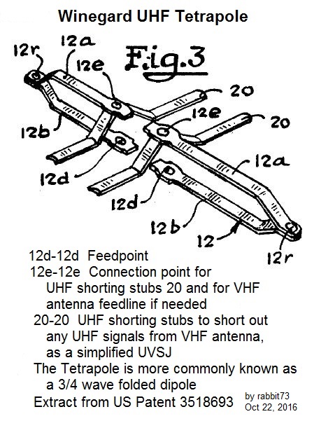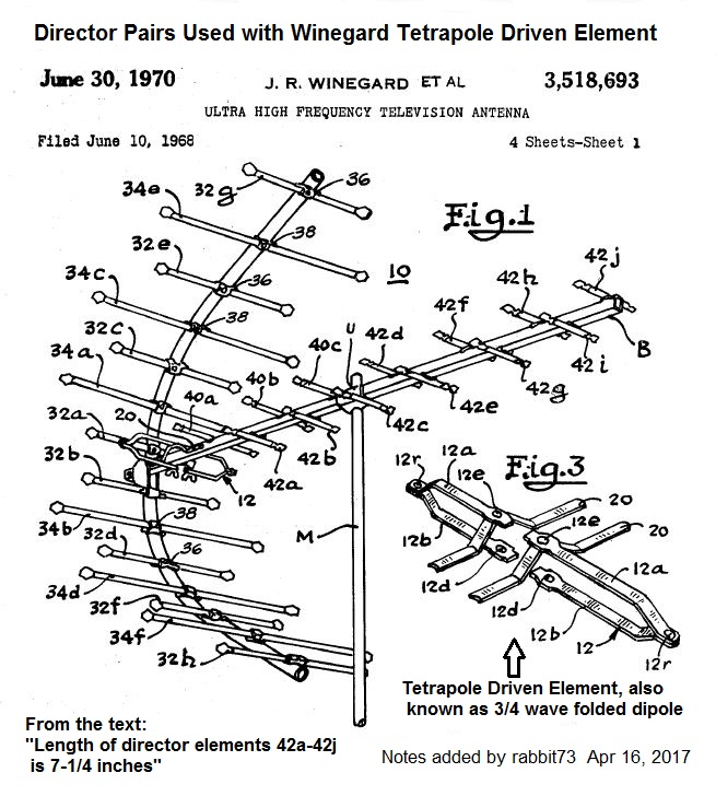 http://forum.tvfool.com/attachment.p...1&d=1492351076 I suspect that the insulated UHF parasitic element in front of the UHF driven element Tetrapole is actually a pair of side-by-side directors that you also see in high gain UHF yagis by other manufacturers. The Tetrapole, AKA 3/4 wave folded dipole, has two current loops that allow the use of pairs of directors in front of it for maximum gain. But, I can't be certain until I have a 751 in front of me to confirm it. http://forum.tvfool.com/attachment.p...3&d=1492047521 You can see the idea of director pairs in Winegard patent 3,518,693. The patent drawing shows pairs of directors, but the patent text claims "a plurality of director elements." http://forum.tvfool.com/attachment.p...1&d=1492362159 |