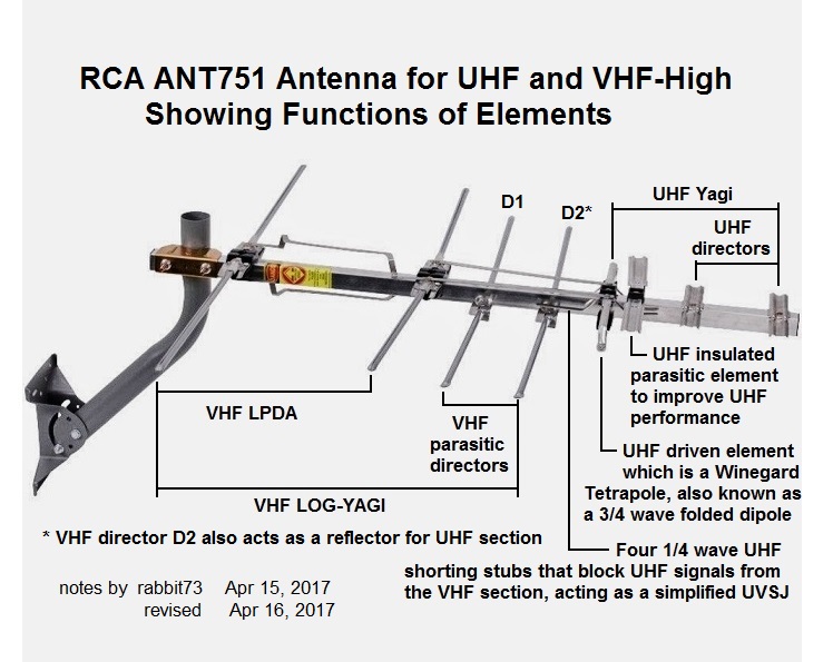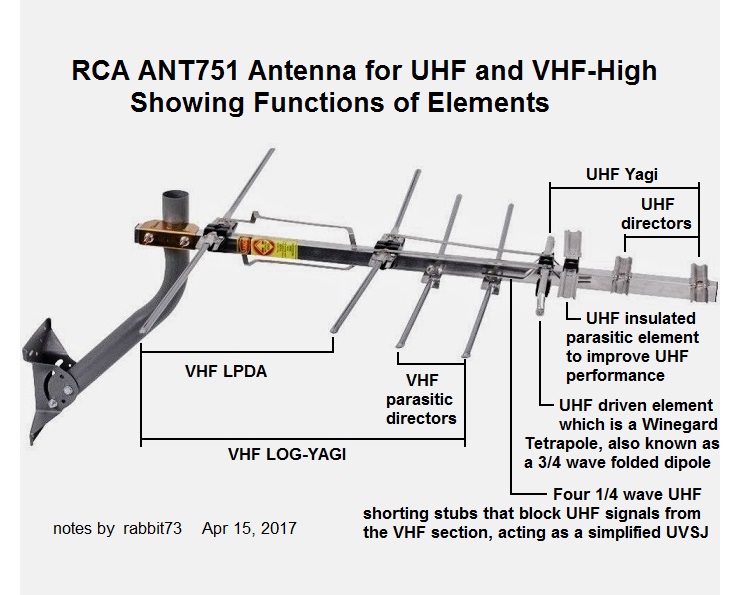 Which elements on the boom of the RCA ANT751 are for UHF and VHF High reception? I've had good use of this antenna for some time now, but was a bit confused as to which are being used for the various TV frequencies; especially since it does not have a reflector behind the UHF elements as is typical. Any help would be appreciated. Thanks! OTAFAN