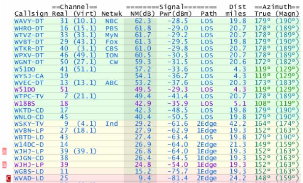 The Noise Margin calculation of the tvfool report assumes that a preamp will be used, which means that a signal must be at least -91 dBm signal power for a NM of 0 dB. If you look at a tvfool report you will will see that there is a constant difference of 91 dB between the NM and dBm signal power. This is where the -91 dBm comes from: The Thermal Noise Floor for a DTV signal is -106 dBm (-15 dB NM). Any signal that is weaker can not be received; an antenna with more gain can not "pull it out of the noise." If you are able to receive a signal with a NM less than -15 dB, either the tvfool report is wrong or the signal has been enhanced by Tropospheric Propagation. To that you must add the minimum required SNR of 15 dB: -106 dBm + 15 dB = -91 dBm, before allowing for the preamp Noise Figure If you do not use a preamp, then you have to add the tuner Noise Figure which is 6 dB average: -106 dBm + 15 dB + 6 dB = -85 dBm; which is where most tuners will drop out What is going on is that the antenna gain must make the signal strong enough to allow for the minimum required SNR of 15 dB and the Noise Figure of the preamp. Once the signal is strong enough for the preamp input, it will compensate for the distribution losses and bury the tuner Noise Figure in the much stronger amplified Thermal Noise Floor. In the case where no preamp is being used, the antenna gain must make the signal strong enough to allow for the distribution losses and the tuner Noise Figure. Maybe a few diagrams will help. Indoor or attic, with and without a preamp: http://forum.tvfool.com/attachment.p...1&d=1499692287 Outdoor, with and without a preamp: http://forum.tvfool.com/attachment.p...1&d=1499692621 You can see how damaging attic/indoor loss is, You can also see how a preamp makes it possible to receive weaker signals, by about 5 dB. This is what a System Noise Figure calculation looks like with and without a preamp. http://forum.tvfool.com/attachment.p...1&d=1499692847 http://forum.tvfool.com/attachment.p...1&d=1499693062 reducing coax loss between antenna and preamp: http://forum.tvfool.com/attachment.p...1&d=1499693334 The main limiting factor when using a preamp to receive weak signals, is the strength of the local strong signals that might overload the preamp or tuner. Even a partial overload can create IMD (Intermodulation Distortion) that can damage the weak signals. In this particular case, WPXA ION is the strongest signal with a signal power of -33.7 dBm, Fortunately, when a directional antenna is aimed 114 degrees, WPXA will be weaker because of the antenna pattern. |