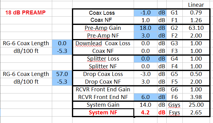 As an example: Assume a tuner NF of 6 dB (probably fairly typical) and a preamp NF of 2 dB. Before the coax, one would already enjoy a 4 dB improvement in the system NF. Add in 50' of RG6 (3 dB) or 100' of RG6 (6 dB) or a 4-port splitter (8 dB) and it's illustrative as to how a weak signal which would otherwise lost in the system, can be preserved enough to be receivable. |