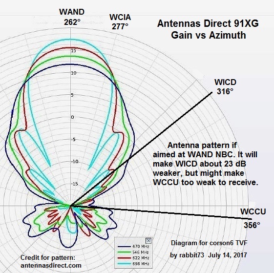 I suggest an Antennas Direct C2V, aimed at about 270 degrees magnetic to favor NBC and CBS. Fox is in a different direction, but it might come in. The VHF dipole for the C2V should be able to pick up PBS. My biggest concern is with WICD that is so strong it will prevent the reception of the weaker channels, as you have already experienced with your indoor antenna. It is, unfortunately in the same general direction as your other channels, so a directional antenna probably will not help, unless you are willing to experiment further, to place WICD in a null in the antenna pattern to make it weaker. If you are not willing to do that type of experiment, then you will probably need a custom filter from Tin Lee Electronics to make WICD on real channel 41 weaker. WICD will be moving to channel 32 in a few years, so you would have to order another custom filter. http://www.rabbitears.info/market.ph...&callsign=wicd WICD has a Noise Margin of 77.3 dB, even before adding antenna gain. http://forum.tvfool.com/attachment.p...6&d=1471824123 Interpreting Noise Margin in the TV Fool Report http://www.aa6g.org/DTV/Reception/tvfool_nm.html This might work: http://forum.tvfool.com/attachment.p...1&d=1500054625 The narrow beamwidth of the 91XG will make WICD a lot weaker, but it has more gain than necessary. Insert an attenuator in the coax of about 10 or 15 dB to keep WICD weak without making NBC too weak. If you need WILL PBS, add an MCM 30-2475 VHF antenna aimed at 272 degrees magnetic. Combine the two antennas with a UVSJ. |