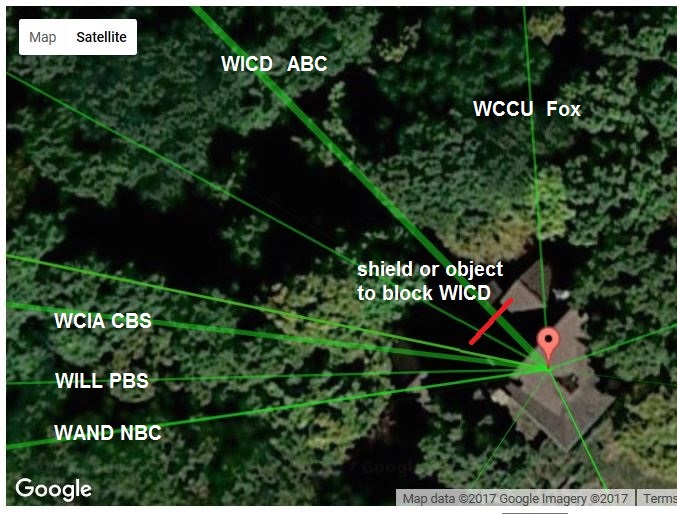 are currently on clearance for about $19.00 or the antennas direct c2v or antennas direct 4 max. Connect the antenna of your choice to one television on a temporary basis, through a door or window. One person watches the tv, hopefully with a signal meter, and the other positions the antenna on the roof. I'd start your aim at about 250 degrees which will help reduce the overload from WICD. Continue to rotate clockwise, 260,270,280 degrees, scanning for your channels in each position. You might just be able to receive PBS from WEIU and not need any VHF antenna at all. It's not an easy prospect but if you can position the antenna where it cannot be seen line of sight by WICD, you have a decent chance of success. |