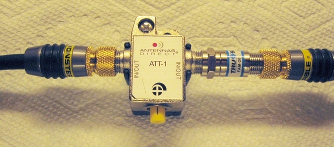http://www.tvfool.com/?option=com_wr...e6a4ee500a804d Another way to define overload is by the Noise Margin number in the report. http://forum.tvfool.com/attachment.p...6&d=1471824123 Interpreting Noise Margin in the TV Fool Report http://www.aa6g.org/DTV/Reception/tvfool_nm.html Thank you for the photo showing the dish; it helps. http://forum.tvfool.com/attachment.p...1&d=1501183717 You have two problems with the HOA, both of which are in a gray area. Their antenna restriction is poorly written. The one meter limit is for a dish. OTA antennas are allowed to be larger, according to the FCC. IF you own the roof and the land, you are allowed to have your antenna at any location needed for good reception, as long as it isn't any higher than 12 feet above the peak of your roof. What is critical is the form of ownership as defined in your contract. It seems that the ramp access is more important to you than the antenna, so I suggest you do some antenna experiments within the HOA rules and use your energy to battle the HOA on the ramp. The main problems are that your signals are in two directions, and there is a great difference in signal strength. There are ways to solve the two direction problem; in your case it is with a bi-directional antenna. The signals from the NW are much stronger than the signals from the SE, but the roof blocks the signals from the SE, making the difference even greater. I suggest you first try the ClearStream 2MAX™ in the dish location. You might need to insert an attenuator to make the signals weaker to prevent overload. It would need to be enough attenuationt to keep the NW signals from causing overload without making the SE signals too weak. The coax should be grounded with a grounding block for the attenuator to be effective. Otherwise, the strong signals could get directly into the TV. The Dish guys should have grounded the coax. https://www.antennasdirect.com/cmss_...es/ATT1_QS.pdf https://www.antennasdirect.com/store...ttenuator.html http://www.solidsignal.com/pview.asp?p=att-1 http://forum.tvfool.com/attachment.p...1&d=1501197384 If more than 20 dB of attenuation is needed, you can add a fixed attenuator of 10 or 20 dB: http://forum.tvfool.com/attachment.p...1&d=1490024524 If you can't find a balance that way, try the antenna in the attic, which will attenuate the signals in both directions. If that doesn't work, I suggest you add the reflector kit for the 2MAX and locate the antenna where the dish is with the reflector (the rear of the antenna) aimed NW and the front of the antenna (loops) aimed SE. The stronger NW signals coming from the rear will be attenuated by the reflector. https://www.antennasdirect.com/store...y-C2M-REF.html It's not clear to me which would be better, the C2V that already has the reflector, or the 2MAX with the reflector kit added; they seem to be equivalent for your situation. The trees on the North side might actually help. |