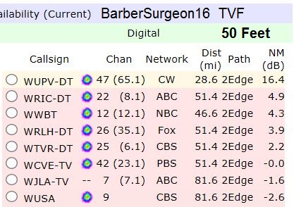 http://forum.tvfool.com/attachment.p...1&d=1504139061 Here is the coverage for WUPV. Note that only 78 kW out of 1000 kW ERP gets to your antenna because of the directional transmitting antenna pattern: http://forum.tvfool.com/attachment.p...1&d=1504139501 http://forum.tvfool.com/attachment.p...1&d=1504140054 |