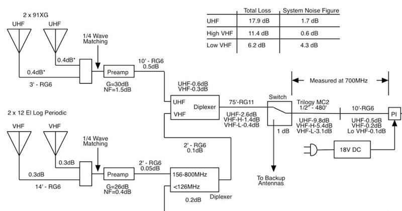 Ordinary RG6 coax with a copper clad steel center conductor would have about the same signal loss as RG6 Quad, but RG6 Quad with a solid copper center conductor would have a much lower voltage drop for the preamp power. RG11 coax would have a lower signal loss, but it is difficult to work with; it is thicker and requires special connectors. The next step up would be 75 ohm hardline as used by cable systems. Calaveras at AVS Forum has much longer run of coax; 575 feet of which 480 feet is 1/2" hardline. He uses a high gain preamp at the antenna and increases the voltage sent up to the preamp by the power inserter so that there is sufficient voltage for the preamp to operate. http://forum.tvfool.com/attachment.p...2&d=1522440096 A forum member at High Def Forum has a solar panel and battery at the base of his tower to power his Channel Master 7777HD/Amplify preamp before a 300 ft coax run. I have measured the minimum required voltage for the 7777HD, which comes with a 5V power supply, as 4 volts. I was able to use a coax run over 300 ft and still have proper operation. Your coax run to your closest hill, Hill B, is 951 feet, but the signals are stronger at Hill A, which is 1424 feet away. http://forum.tvfool.com/attachment.p...1&d=1506802086 If you moved your antenna to Hill B, you could try the 7777HD preamp at the 30 dB high gain setting with RG6 Quad solid copper center conductor. You would need to increase the voltage sent to the preamp from the power inserter inside, or power the preamp at the base of the 20 ft mast on the hill. |