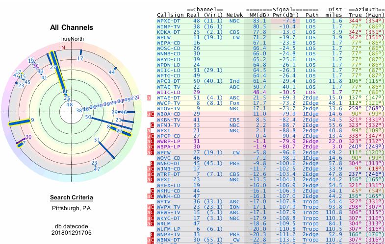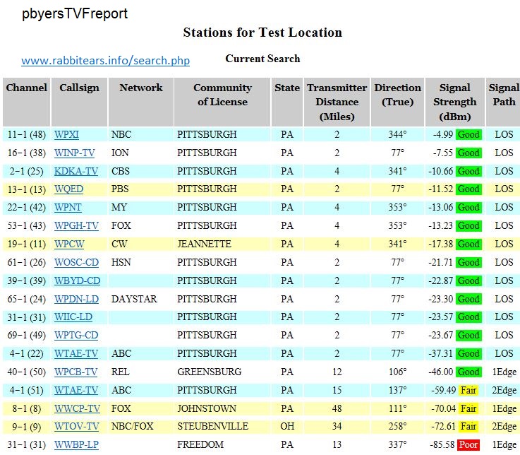 Yes, WQED is missing from TVFool reports because there are errors in the database used to generate reports as a result of many repack changes. I doubt that TVFool will make corrections because they have a small staff. Here is a report for Pittsburgh with WQED missing: http://www.tvfool.com/?option=com_wr...9038ac4327853b http://forum.tvfool.com/attachment.p...3&d=1533859641 This report from rabbitears.info shows WQED: http://forum.tvfool.com/attachment.p...4&d=1533859937 https://www.rabbitears.info/market.p...&callsign=WQED This shows the repack changes for the Pittsburgh DMA. Note that WQED will move to VHF-Low channel 2, which requires an antenna with large elements. There is a high noise level on VHF-Low from electrical interference, which will create a reception problem for some viewers. https://www.rabbitears.info/repackch...=&lss=&status= Most of the changes will be during Phase 4: Testing Begins: 6/22/2019 Phase Ends: 8/2/2019 https://www.fcc.gov/about-fcc/fcc-in...ition-schedule https://www.commlawcenter.com/2017/0...deadlines.html |