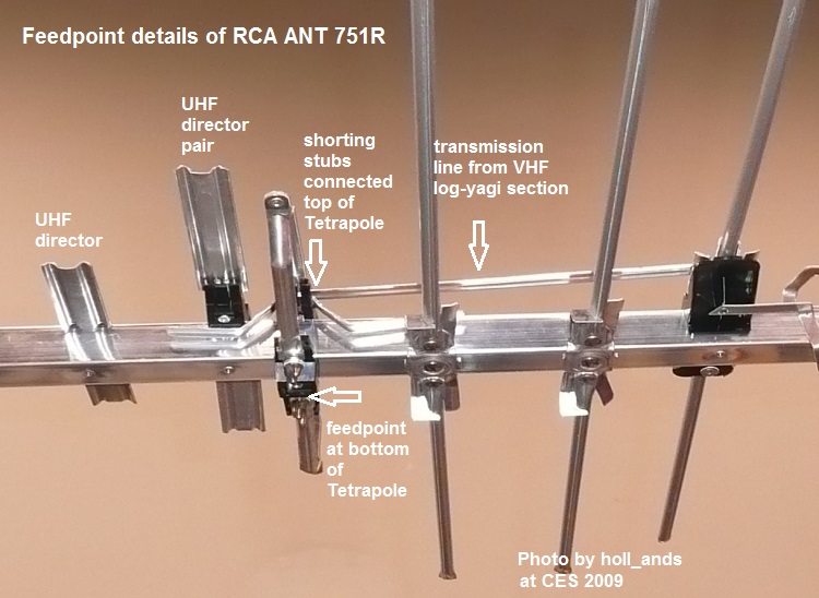 The Tetrapole was invented by John Winegard, and he used side-by-side director pairs in his patent. https://i.imgur.com/azbVg5F.jpg https://forum.tvfool.com/attachment....6&d=1565204259 In the current 751E, they went back to the original design: https://forum.tvfool.com/attachment....4&d=1565201082 GroundUrMast is correct. The center of parasitic elements (director and reflector) can be attached to the boom because that is a zero voltage point; it doesn't affect the performance of a Yagi antenna. However, the VHF section of the 751E is a hybrid design. The two rear VHF elements are a Log Periodic design that are connected together and then connected to the top of the UHF Tetrapole driven element where they are combined with the UHF signals. The front two VHF elements are parasitic Yagi director elements to increase VHF gain and can be fastened to the boom without harm. That is why the VHF section is called a Log-Yagi. |