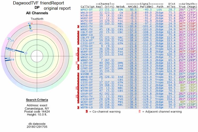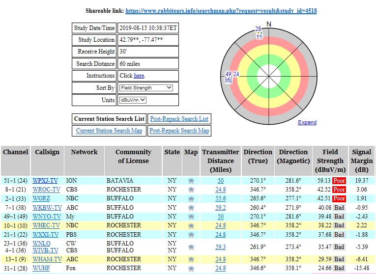 https://forum.tvfool.com/attachment....6&d=1565882026 The above report is based on his address, which is from a marker further down the hill. This report is based on the coordinates of his house which is at the north end of his lot (I think), further up the hill; the signals are stronger: https://forum.tvfool.com/attachment....7&d=1565882095 This is the link for the revised TVFool report based on the coordinates of his house: http://www.tvfool.com/?option=com_wr...90386a1d9f6f12 This report is from rabbitears.info: https://forum.tvfool.com/attachment....8&d=1565882420 This is the link for the rabbitears.info report: https://www.rabbitears.info/searchma...&study_id=4518 He might have a chance of getting a few of the ones at the top if he uses a Solid Signal HDB91X or an Antennas Direct 91XG antenna and a preamp like the Antennas Direct Juice or the older Antennas Direct PA18. |