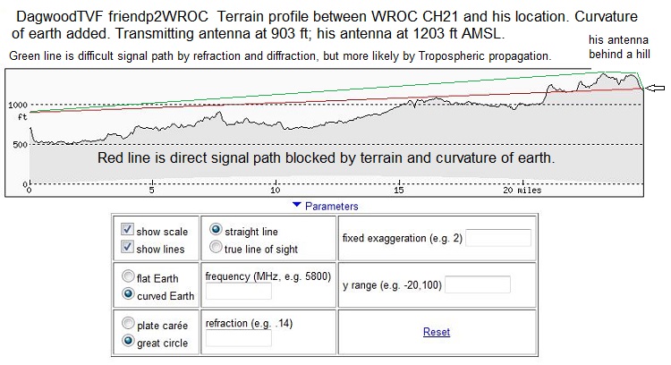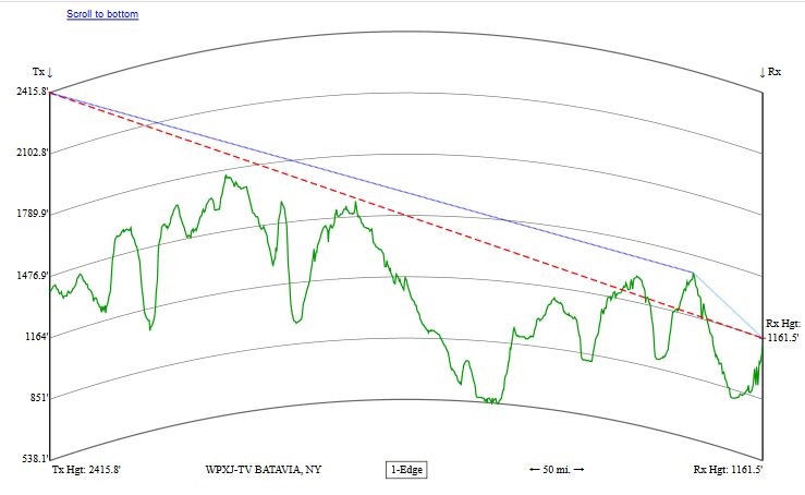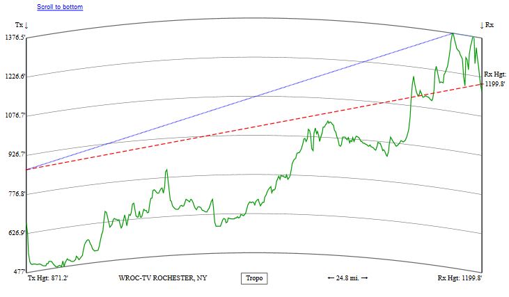 WROC has moved to channel 21, but the transmitter is still at the same location. This is the profile by TVFool for his location: http://www.tvfool.com/?option=com_wr...dALLTV%26n%3d8 This is the WROC profile from the rabbitears.info report for his location by clicking on distance in the report: https://forum.tvfool.com/attachment....1&d=1565895259 https://forum.tvfool.com/attachment....2&d=1565897142 Again, the terrain blocks the signal even before it gets to the TREES. |
