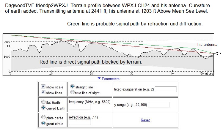 If you click on the rabbitears.info report for his location https://www.rabbitears.info/searchma...&study_id=4518 and then click on the Transmitter Distance (Miles) for a channel, a profile for that channel will come up. This is what the WPXJ terrain profile looks like. The red line is the direct signal path blocked by terrain; the blue line is the probable signal path. https://forum.tvfool.com/attachment....9&d=1565891253 There is a profile available from TVFool, but it is no longer correct because the WPXJ transmitter moved when it changed real channels from 23 to 24: http://www.tvfool.com/?option=com_wr...dALLTV%26n%3d1 This is the WPXJ profile using other software: https://forum.tvfool.com/attachment....0&d=1565893676 |