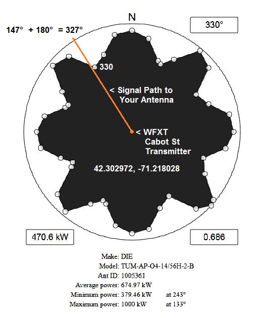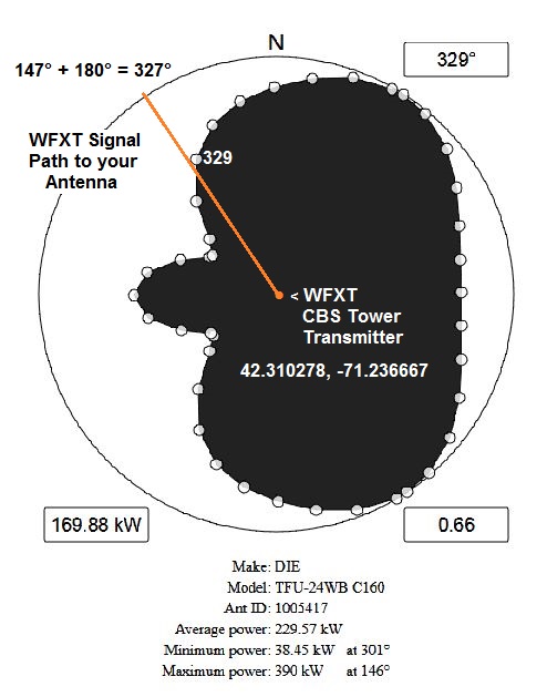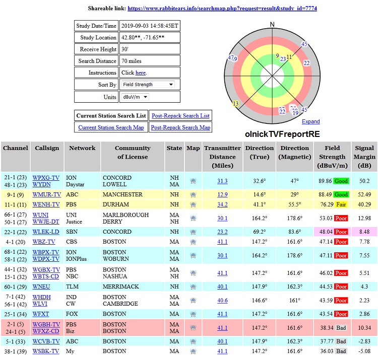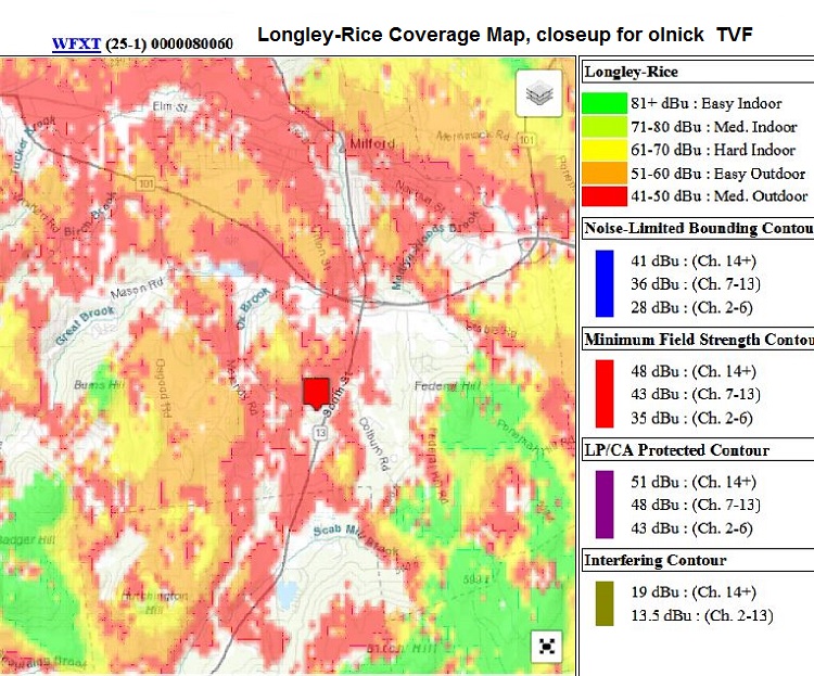 https://www.rabbitears.info/market.p...=64833#station If you look at the Boston Repack plan, you will see that WFXZ sold their license in the Repack reverse auction. https://www.rabbitears.info/repackch...=&lss=&status= WGBH is the Host: https://www.rabbitears.info/market.p...n=WGBH#station WGBH is now using Circular Polarization with 6.7 kW Horizontal and 6.7 kW Vertical ERP. https://www.rabbitears.info/tvq.php?...ms&facid=72099 WGBH would be listed higher up, but a correction factor has been subtracted from the Field Strength to allow for the higher noise level on VHF-Low. Notice that its Signal Margin is 10.34 dB as a result, which is out of order. VHF-Low signals can make it over hills better than UHF signals. So, even though they will be on the same tower, they will be on different TV bands. If you are still not able to get WFXT after Repack, the only thing that I can think of to try is a WFXT dedicated UHF antenna like the Antennas Direct 91XG or Solid Signal HDB91X mounted above the trees with the front end tilted up to possibly catch the signal coming down from the peak of the hill. I wish you good luck. |