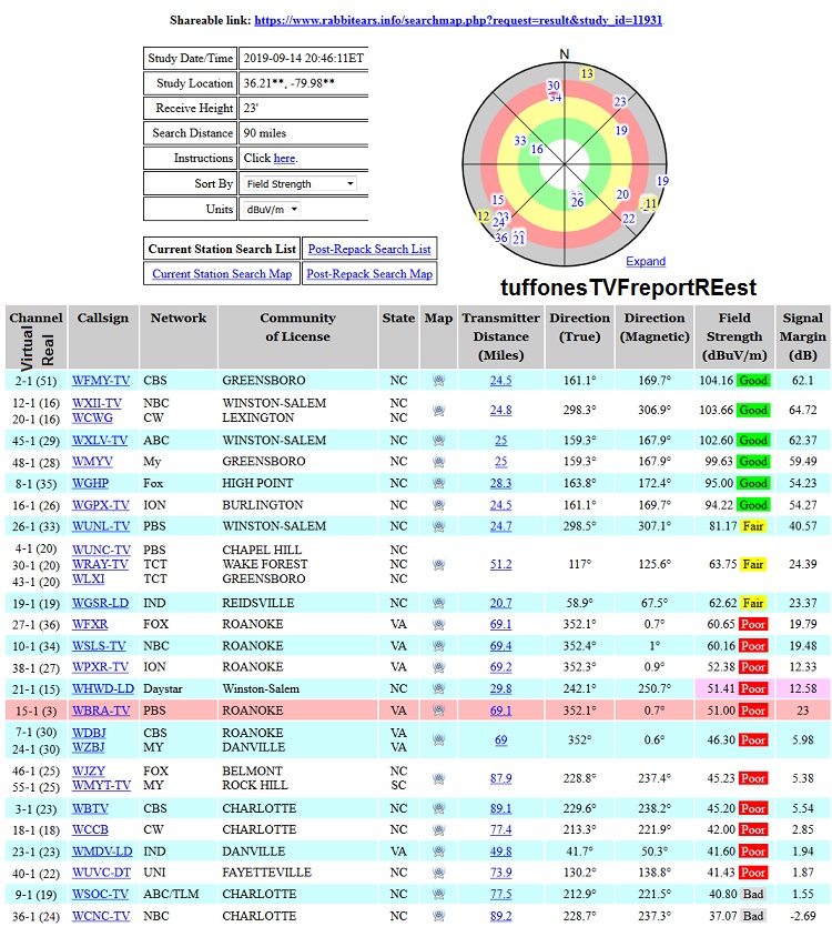 Thanks for the signal report. Here is a report from rabbitears.info based on my estimate of your location from your TVFool report. It should have a more accurate list of channels: https://www.rabbitears.info/searchma...study_id=11931 This is the Repack plan for Roanoke: https://www.rabbitears.info/repackch...=&lss=&status= |