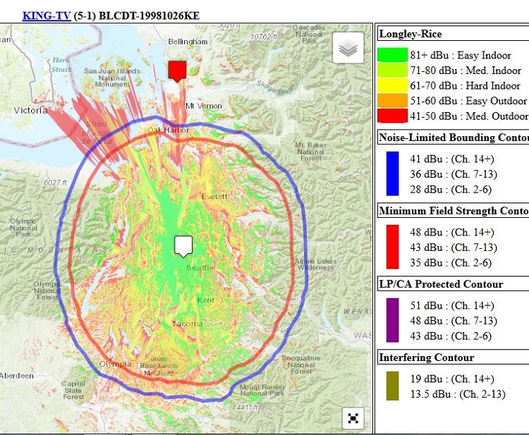 https://forum.tvfool.com/attachment....8&d=1569281189 Estimated signal report from rabbitears.info: https://www.rabbitears.info/searchma...study_id=14062 https://forum.tvfool.com/attachment....0&d=1569283019 Seattle Repack Plan: https://www.rabbitears.info/repackch...=&lss=&status= The changes are to be completed during Phase 7, 10/19/2019 to 1/17/2020 https://www.fcc.gov/about-fcc/fcc-in...ition-schedule In addition to concerns about the preamp and the coax, the HD8200U has the CB-8269 balun housing that sometimes gives trouble. https://forum.tvfool.com/attachment....1&d=1569288248 You are outside the KING area of coverage: https://forum.tvfool.com/attachment....2&d=1569288640 The coverage at Bow is very spotty. Red is the weakest listed color; no color is weaker. https://forum.tvfool.com/attachment....3&d=1569289069 |
