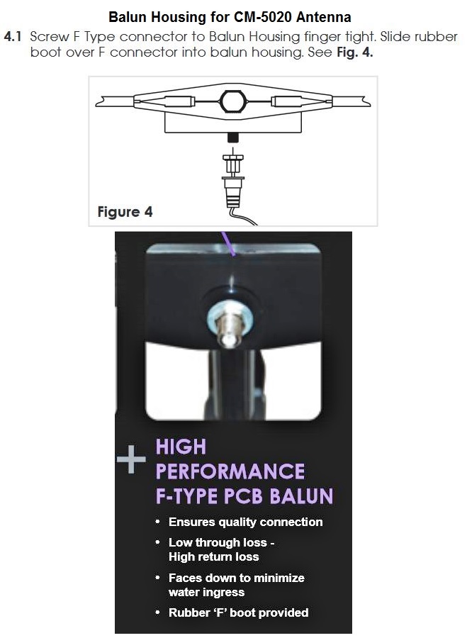 Tim, when the CM-5020's original "built-in" balun failed I called Channel Master. They stated that I could not get an exact replacement balun, instead all they offered was the CM-94444 in-line balun. I had to cob the CM-94444 on to the frame of the CM-5020 antenna. I sealed it as best I could with 3M black mastic tape so it's possible its leaking. When I replace the balun with a new CM-94444 I'll simply let it hang down with the protective boot over the coax.
