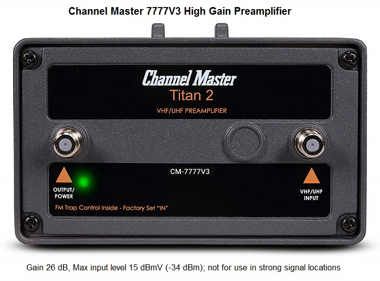 https://forum.tvfool.com/attachment....0&d=1575730865 Their previous 7777 with the single antenna input doesn't have a good reliability record: https://forum.tvfool.com/attachment....2&d=1575732193 Their new 7777V3 looks promising, but it is as yet unproven. I suspect it will be more reliable. https://www.channelmaster.com/TV_Ant.../cm-7777v3.htm https://forum.tvfool.com/attachment....3&d=1575734997 |