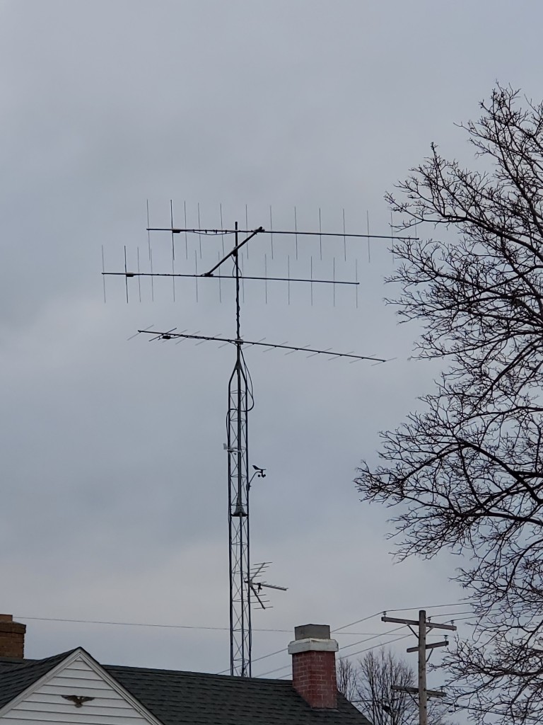 The beam just below it is a Cushcraft A13B2 beam installed with horizontal polarization, also for the 144-148 MHz ham band. Horizontal antennas are usually used for SSB (single sideband voice) and CW (Morse code). Just for a reference, the booms on these antennas are 15 ft long and the elements are about 40 in long. It does look like one of the beams has slipped a bit on the mast and is pointing a little bit off. Tim WS4V |
