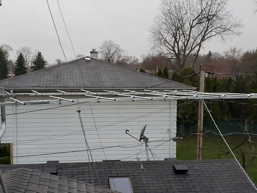 I definitely wanted to get it done though because I think we're going to have rain the next couple days. I was only about halfway done when the rain started to fall. I couldn't haul both of the antennas up by myself so I took one of them off the crossbar. Next time I'll take both of them off the crossbar. I wish I could have measured the spacing between the booms a little bit better but the rain began to fall quite a bit harder. They're kind of pigeon-toed right now judging by looking at the pictures. So, I ended up plugging in the two VHF antenna array into the VHF half of my RCA PREAMPR1... I used the CC 7870 as the combiner. I'm going to have to make two new cables as they are stretched to their limit. I don't want to break the plastic baluns. I took the ladder down and right after it stopped raining for a few seconds so I put the single 30-2476 back up on the mast in the lower position. The Spectrum analyzer pattern looks similar to when I had the pair down low like that so maybe it's roof reflections or ground reflections. I don't think the signal of the two antennas is any stronger than the single antenna even when mounted up high. Still, there's room for improvement I feel. http://forum.tvfool.com/attachment.p...1&d=1586654511 |