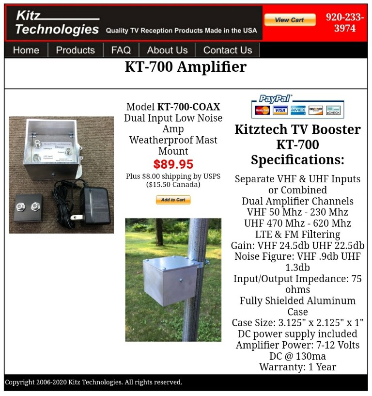 No, unfortunately the KT - 700 is a tiny bit noisier but it also has a built-in FM filter and LTE filter which raised the noise level up by about .5dB on VHF and .8 dB on UHF which is still lower than any commercially available preamp. Extra filtering will raise the noise up , it's unavoidable. I was using the KT-200 with a UVSJ. I went with the KT-700 because I wanted dual inputs and did not want to leave the UVSJ up high on the mast. I would have had to create another enclosure. Plus the UVSJ does have a little bit of loss about .5dB which increases the noise. The KT-700 was exactly what I wanted. Plus, I felt I was pushing my luck with my RCA PREAMP1R due to their high failure rate. I had already replaced them anyhow. And cost wise, it's on the same price level as the Channel master 7778 dual input. Shipping was also very fast. http://forum.tvfool.com/attachment.p...1&d=1597792225 http://kitztech.com/kt700.html |