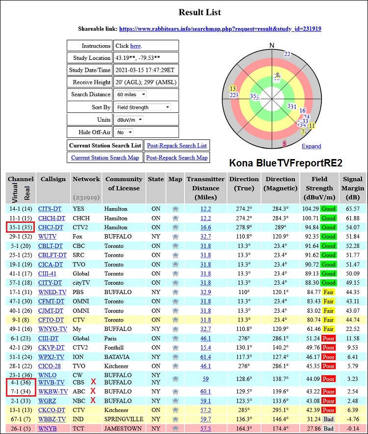 The dead zone makes sense since I am in the shadow of the escarpment. I am down near the lake so anyone in town closer to the escarpment would be completely out of luck. I tried one of those stick-on flat cheap Amazon antennas behind the downstairs TV and surprisingly it can pick up WUTV with some freezing so maybe a proper antenna in the attic would get me one or two channels from Buffallo. Will have to give that a try.