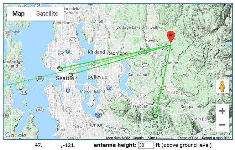https://forum.tvfool.com/attachment....1&d=1616277928 https://forum.tvfool.com/attachment....2&d=1616277969 9-1 (9) KCTS and 11-1 (11) KSTW are both listed at about the same strength; but you receive KCTS better. KCTS is licensed in Seattle and KSTW licensed in Tacoma, but the towers are close together in Seattle on Capitol Hill. https://forum.tvfool.com/attachment....3&d=1616283516 The original 4228 was designed primarily for UHF signals, but it has some useful gain on VHF-High (7-13). https://forum.tvfool.com/attachment....4&d=1616283879 KCTS and KSTW have a similar terrain profile; there is a hill in the signal path: https://forum.tvfool.com/attachment....5&d=1616285127 KCTS is running 21.7 kW ERP to an non-directional antenna and KSTW is running 100kW ERP to a very directional antenna that sends much less than 100 kW in your direction. I suspect that the KSTW signal is weaker at your location because of the slightly different signal path, the signal diffraction at the crest of the hill, and the trees surrounding your location. If you want to improve the reception of KSTW, you will need a separate antenna designed for VHF-High like the Stellar Labs 30-2476 or 30-2475. This antenna should also improve the reception of 13-1 (13) KCPQ. Try it without its own preamp first. KFFV is much weaker. If you are not able to receive it with your 4228 antenna aimed at 238 deg true, you could try adding a medium gain preamp at the antenna. The risk is that the much stronger signals from the south might cause overload even though they are in a different direction. A last resort for WFFV would be a third separate antenna for UHF like the Antennas Direct 91XG or Solid Signal HDB91X with a custom bandpass filter for channel 16 and a preamp. |