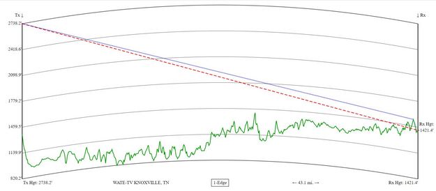 Here is the link to the OP's RabbitEars report: https://www.rabbitears.info/searchma...tudy_id=275857 Cotton, looking at your signal report it looks like the Knoxville stations to your west might be difficult to pick up at your location. Seems there is a big hill or ridge about a mile to your west that is having a detrimental effect to the signals. It is very doubtful that an antenna in any of your windows would work. RabbitEars shows your Knoxville signals as "Poor" and to have any chance of getting them would most likely require a large UHF antenna such as the 91XG you mention plus a VHF-Hi antenna such as a Stellar Labs 30-2476 and they would need to be outside as high as possible. Even then I would think it would be highly unlikely to get reliable reception from Knoxville based on your signal report. I could be wrong, but that's my guesstimation. Attachment 4219 |