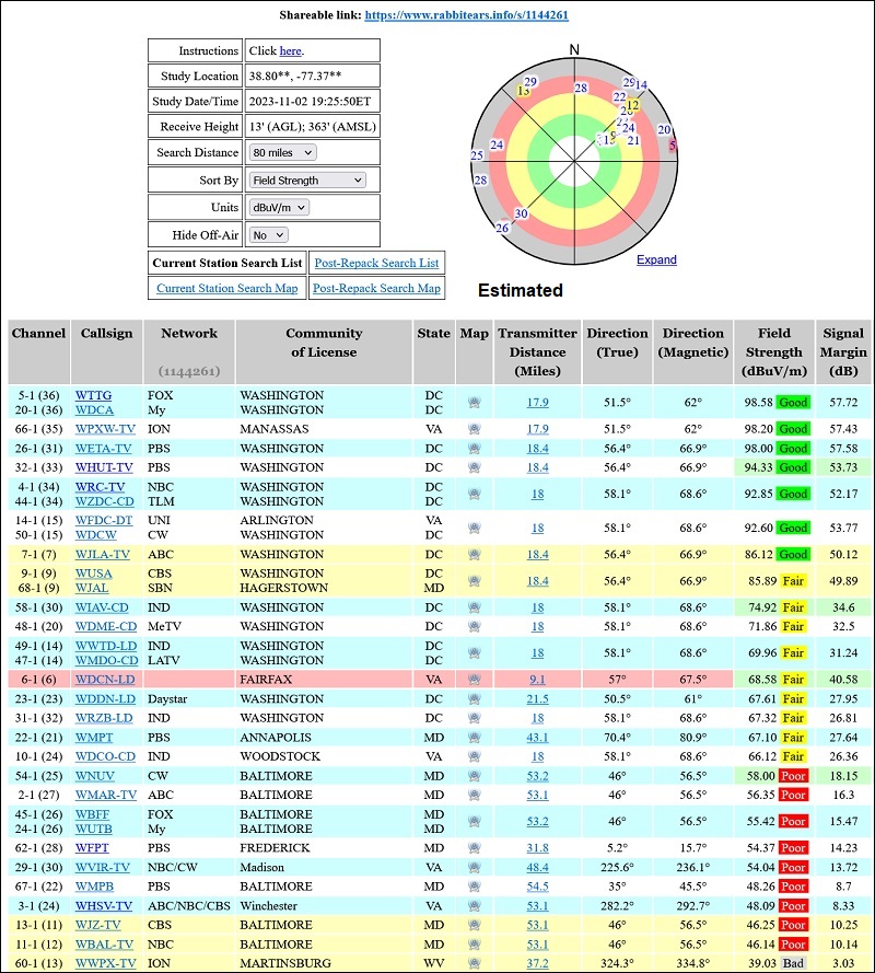 Here is a signal report from rabbitears.info based on an estimate of your location: https://www.rabbitears.info/searchma...udy_id=1144261 https://forum.tvfool.com/attachment....1&d=1698971510 You can do a more exact report here (I use coordinates): https://www.rabbitears.info/searchmap.php WHUT is the light house channel for the new ATSC 3.0 broadcast standard: https://www.rabbitears.info/market.p...=27772#station You can click on other channels to see the subchannels. If you have a new TV with an ATSC 3.0 NextGen tuner, you might be able to see some of the unlocked experimental channels. https://forum.tvfool.com/attachment....2&d=1698972555 |