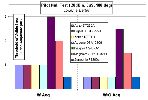 That 0.5 dB differential (left portion of above image, W Acq) for pilot nulling might not seem like much improvement.   But if the pilot signal is lost, the system will lose lock.  The pilot is located at the low frequency end of the 6 MHz DTV spectrum and is a fundamental synchronizing signal.  A multipath signal could cause a frequency dependent null to severely attenuate the pilot.  Recall, that