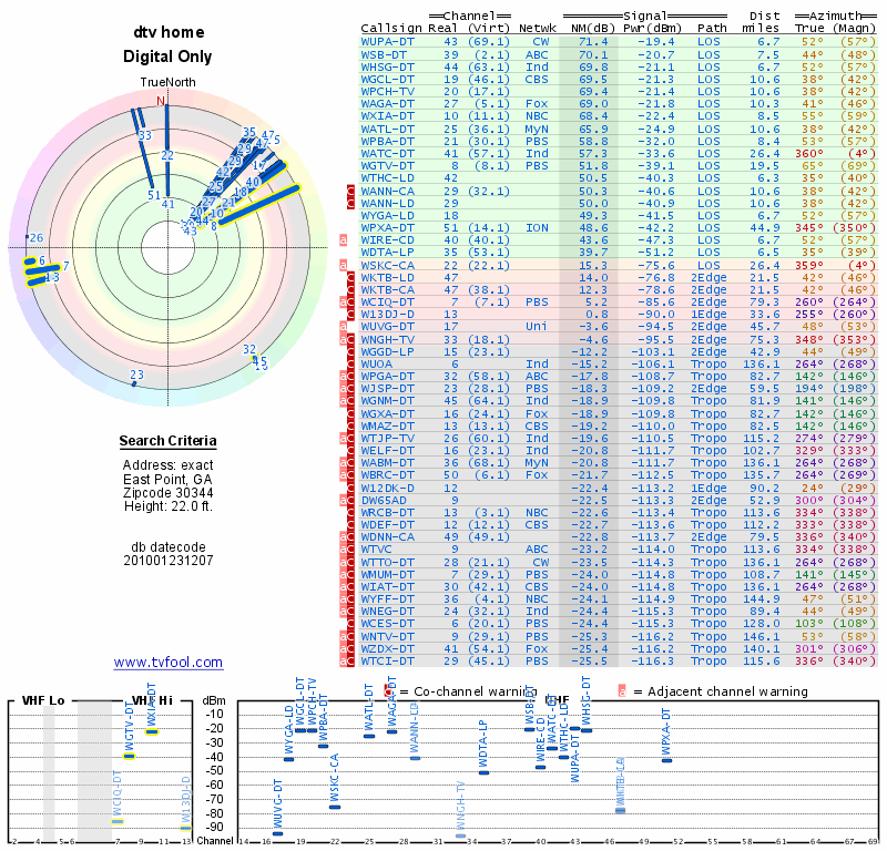 All the stations I want are transmitting from the NE (~38-69 deg). TVFool tells me set top antennas will be fine, AntennaWeb tells me I need a blue antenna for WGTV and a red for most everything else. Please see attachments. Address and AGL was the same, I checked the trees box on AntennaWeb. (I have at least ten trees +50 ft tall dispersed behind my house between my future antenna location and the NE transmitters.)