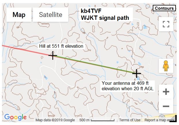 The signal report is only a computer simulation. I suggest you try the 91XG at 20 feet for 16 and 21 with a preamp. It sometimes helps to tilt the front end of the antenna up. Also note that those two channels are about 18 degrees apart, and will be scattered by diffraction at the terrain peaks.