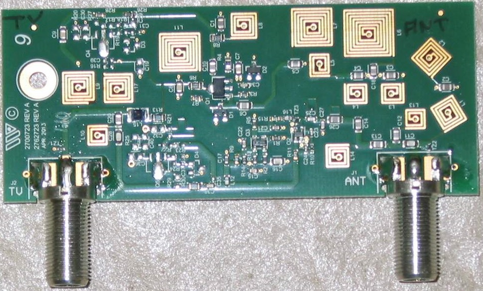 Some of the spiral PCB inductors are associated with the input and output diplexers. Like UVSJ, the diplexers separate VHF and UHF for amplification then recombine at output. Also, some spiral inductors are associated with the FM Trap.