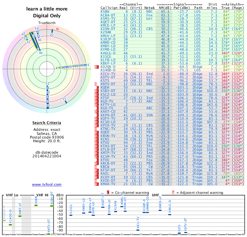 Further info - that I'm surprised at: The 14-mile transmitter site - at almost exactly 180 degrees - is shaded by a gigantic oak tree just outside my house. The tree only affects the rabbit ears antenna, though. The antenna mast is far enough back on the house to have a clear direct line (partly because it is as high as it is) to the transmitter site. So... Looks like it would be of benefit to me to use the antenna mast for