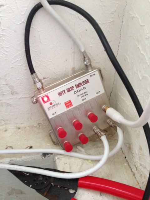 Splitter from antenna to drop amp to cable joiner at mid flr set up to god knows what in walls to drop amp to tv.