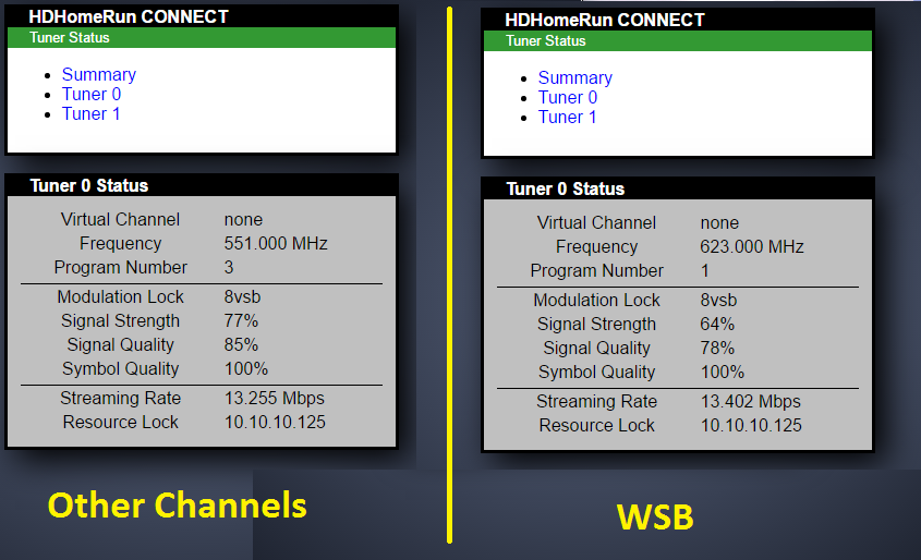 Enclosed, is a snapshot of my typical signal strength. Most Channels appear as the left image but WSB as you pointed out is weaker and on the right. Right now there is zero flutter so my picture is perfect.