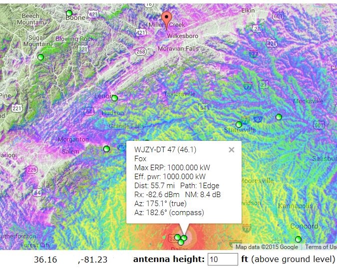 Now look at your report. Use the DB8e as high up as you can get it and experiment with aiming. I'd bet you can get all of the green and yellow on your report and quite a lot of the pink as well. That should give you enough channels, especially with all the secondary networks that have popped up, to keep you busy. In my location it works out to about 54 channels of programming from the Triad and the Roanoke area.