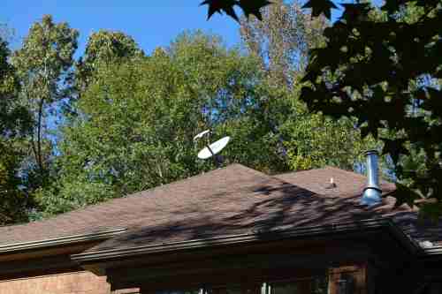 The problem I still have are trees. I have attached a picture looking at the dish from the ground, looking towards 340, and as you can see there are large trees in the line of sight. Actually my house is surrounded by trees so there is no location where I can avoid trees except for 110 degrees.