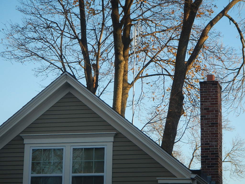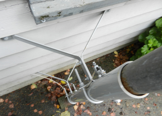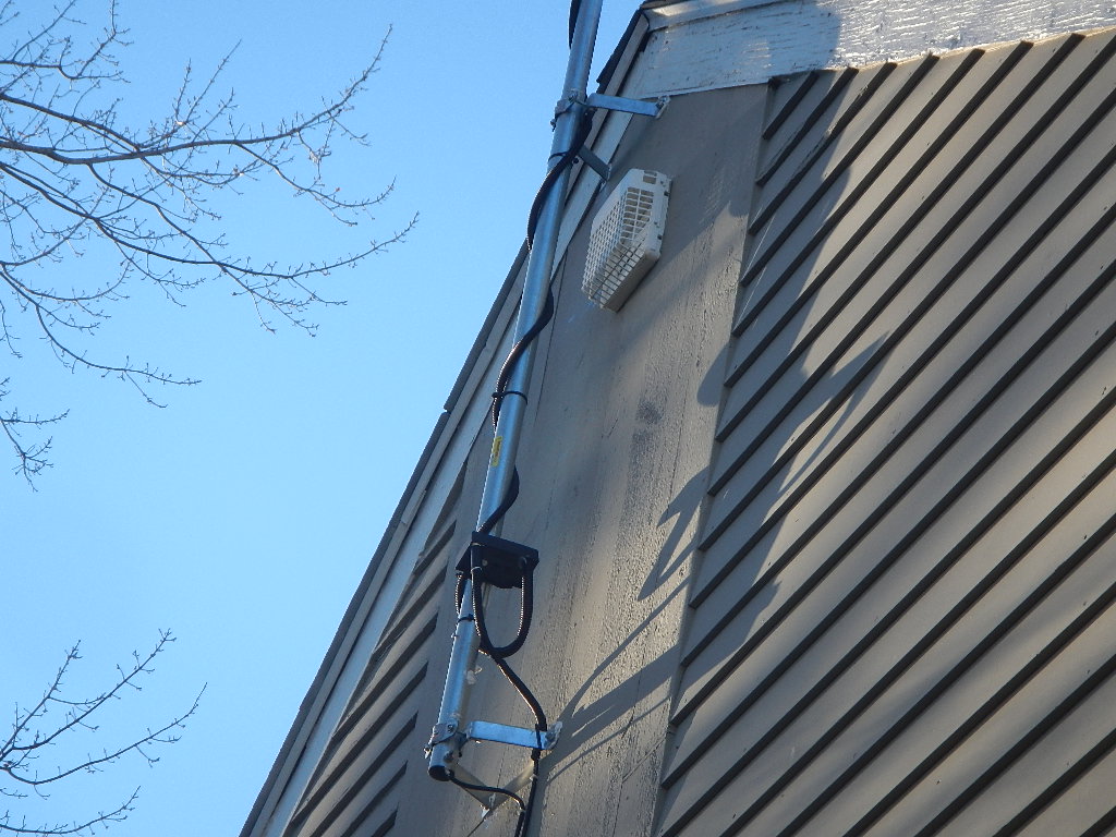 I believe that the installer said that he has a 1.5" pole inserted about 4.5' into the originally-installed 2" pole. The supports attached to the condo are very solid wood so I'm not concerned about the supports popping out. The installer said that 4 points would be needed for guy wires (and didn't put in any), we probably really only have two points (?) available, both on the roof. The adjacent trees certainly can't be used as they sway even more than the antenna.