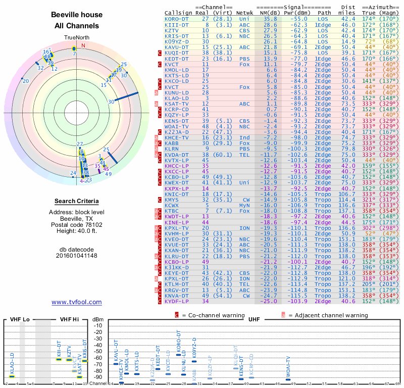 I'm having a hard time with the channel numbers. Real channel numbers don't have a decimal point, and virtual channel numbers do have a decimal point, but you are using numbers without a decimal point for virtual channel numbers. Also, the report doesn't always list the virtual channel number, which is why I asked for callsigns.