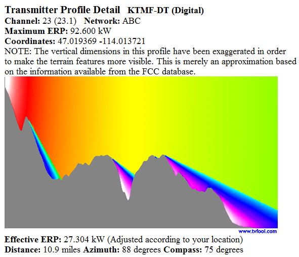 You can see how the terrain might interfere with the signal on its way to your antenna. The tvfool report simulation doesn't take into consideration ground clutter like trees or buildings. UHF signals can't diffract over terrain obstructions as easily as VHF signals.