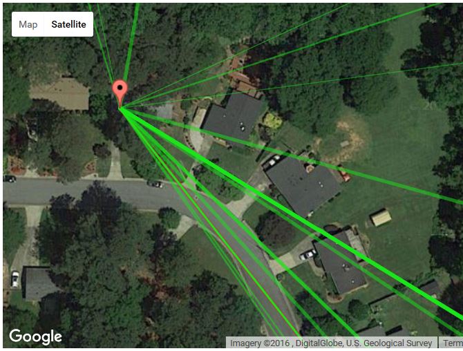 This photo shows the green signal lines from the SE. They clear the trees across the street, but I'm worried about a clear path through the trees in front of your house. You might have to trim some branches.