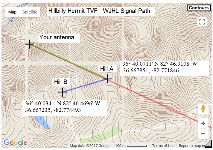 What if he got landowner permission to put an antenna up in a tree on "Hill B", which is about 700 feet away. If he used RG-11, the losses even at the high end of UHF (700 MHz) would be around 20 dB. A CM-7777 pre-amp has 30 dB of gain, so it seems like this could work? I found a 1000-foot role of RG-11 for only $100. If he put in on "Hill A", the run is closer to 1000 feet but since the signals are about 20 dB stronger there, Hill A might be the better option.
