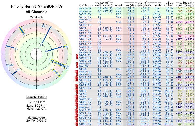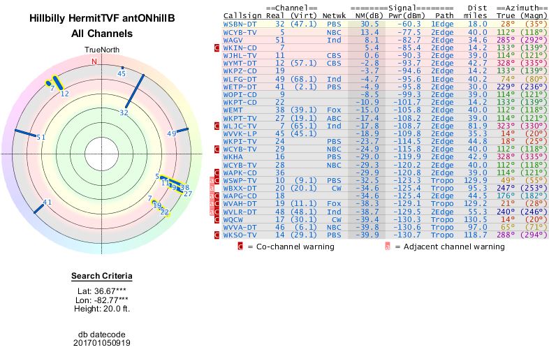 TVFool report if your antenna is on Hill B, which is closer to your house. The signals aren't as strong as on Hill A, but stronger than at your house: