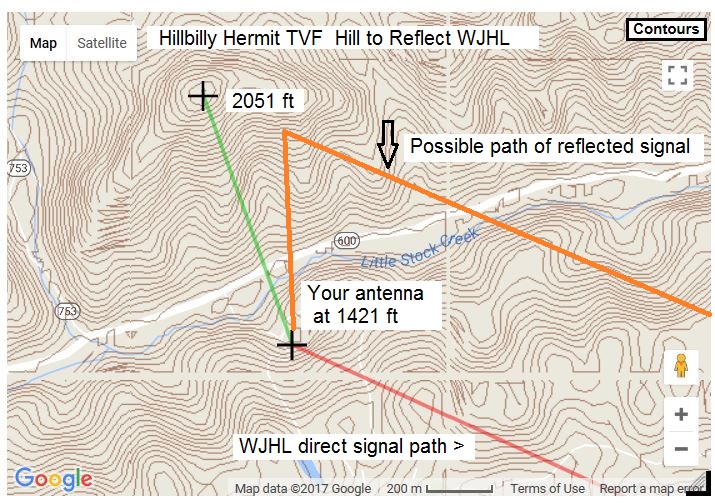 This shows the hill just south of your location that blocks the WCYB 5 signal: