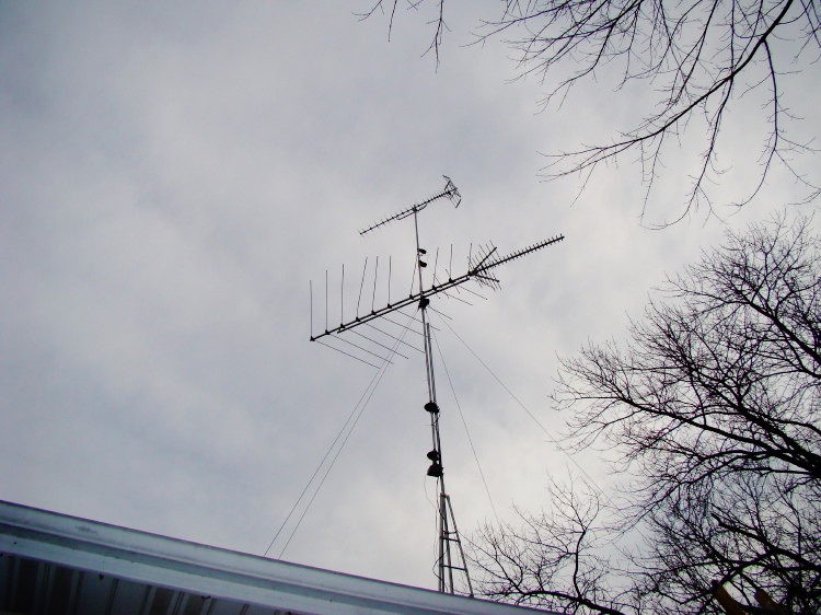 He presently has a HDB91X UHF antenna at the top of the mast aimed at Milwaukee, and a Radio Shack VU-210XR VHF/UHF antenna below it aimed at Chicago, depending on rotator aim.