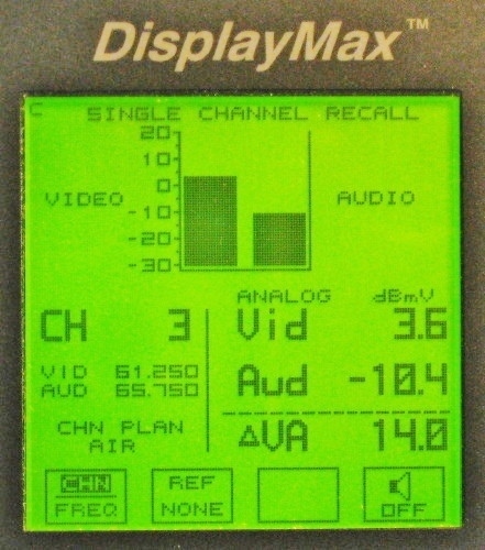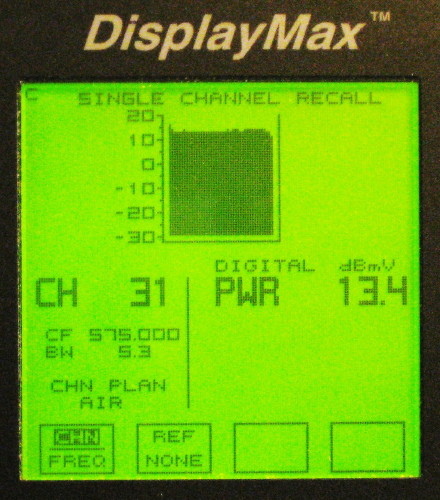 A second test was made using the digital mode of the Sadelco DisplayMax Signal Level Meter (SLM). In this mode, the meter is sensitive down to -20 dBmV (-69 dBm). I added two preamps in series before the SLM: