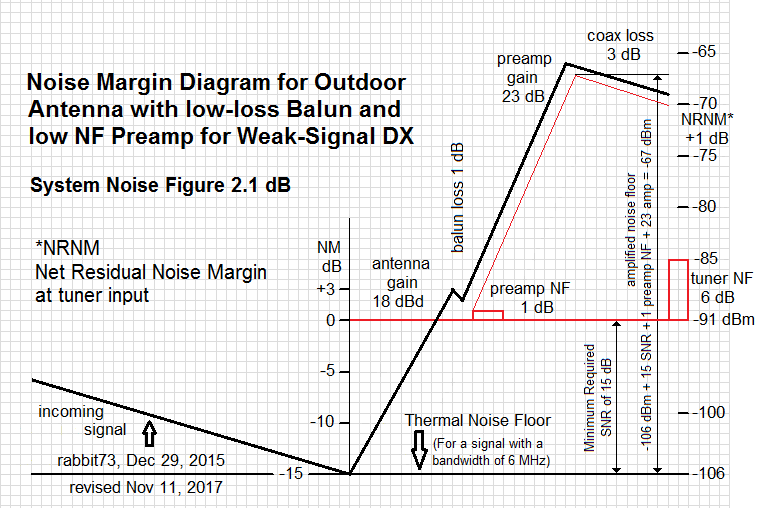 A forum member questioned my statement, saying that it IS possible to receive signals with a NM less than -15 dB if you use an antenna with more gain. At that time, I had no way to prove it either way, other than to say a signal that weak would be buried below the thermal noise floor at -106 dBm for a 6 MHz bandwidth DTV signal.