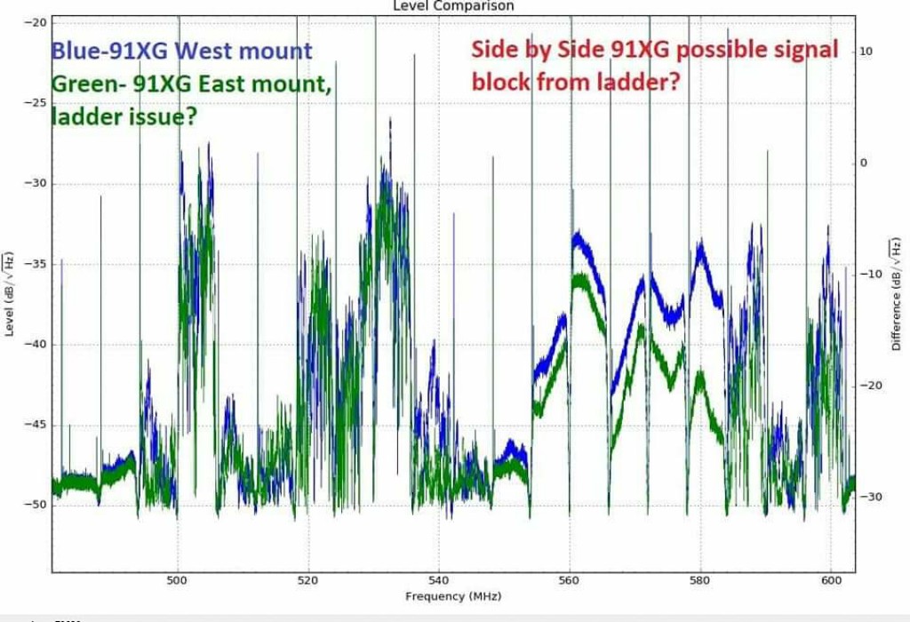 At first I thought it was a ladder blocking signal under the right side so I moved them over to my other mast. Yes, there is still a ladder under the antennas. This one is much lower under the array and more equal between the two antennas.