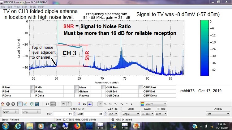 A $25 SDR dongle used as a spectrum analyzer is not lab-grade equipment, but when the SNR given by the scan agrees with the SNR given by my SONY TV as shown in post #10, that's good enough for me. However, it is necessary to adjust the SDR gain to the proper level. With the RTL-SDR.COM V3 dongle and the free open-source spectrum analyzer software, it should be increased to the point where the noise floor just starts to rise. With the RTL-SDR.COM V3 dongle and SDR# (SDRsharp) software, SDRplay RSP1A and Airspy R2, the gain should be adjusted for max SNR, which is usually not max gain.