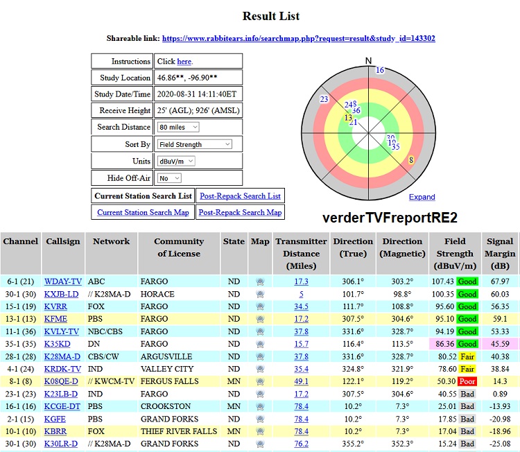 15-1 (KVRR) Fox, Real channel 19, 111.7 deg True, Signal Margin 56 dB