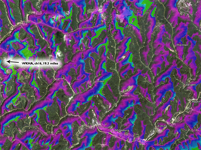 Here's a map showing the differences between the two stations (this animated gif will flip back and forth between WKHA and WAGV). The hilly terrain breaks up the coverage quite a bit. For WKHA, the west-facing slopes are lit up. For WAGV, the signal is weaker because the transmitter is farther away, and it's mostly lighting up the south-west facing slopes.