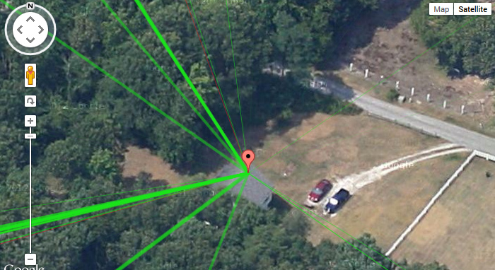 The picture shows that a location that is about 25 feet from the house in the ~North~ direction will be better able to take advantage of the clear area of the trees in the South West direction toward Washington.